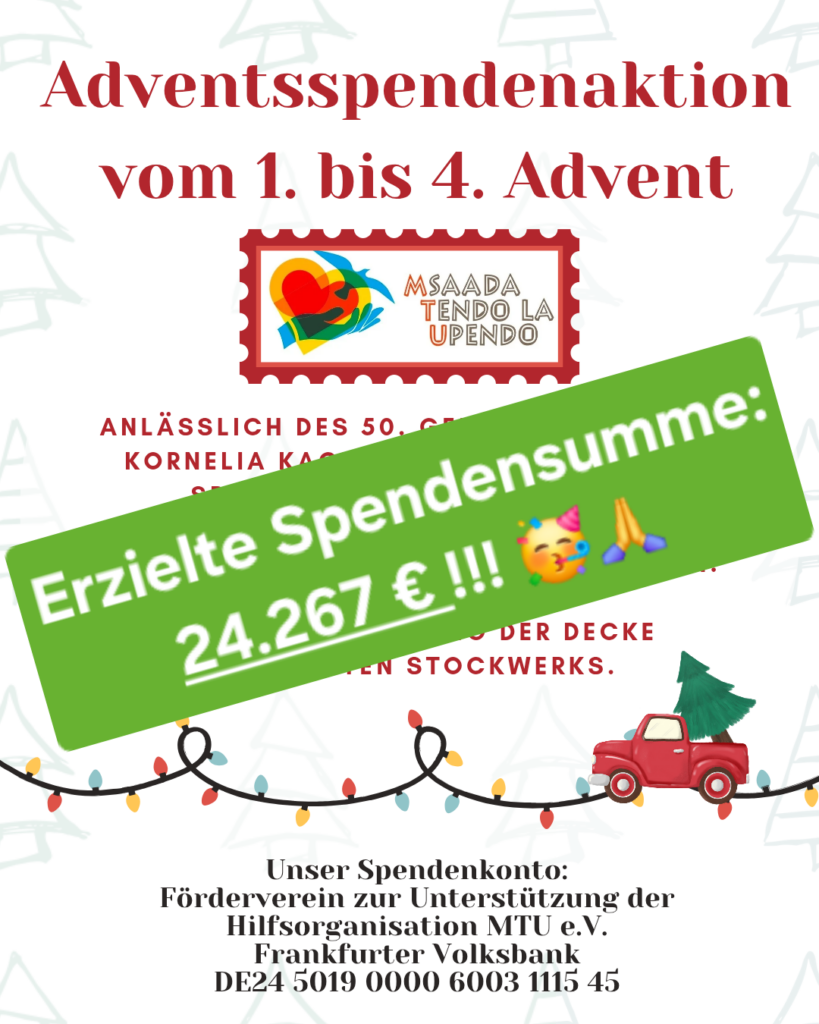 Wir sind unglaublich dankbar und zutiefst ergriffen, dass wir anstelle der angestrebten 5000 € bei unserer Adventsspendenaktion vom ersten bis zum vierten Advent eine fast fünfmal so hohe Summe erzielen konnten: Es haben insgesamt 95 Spender eine Gesamtsumme von 24.267 € gespendet!!! Das ist für uns das perfekte Weihnachtsgeschenk!